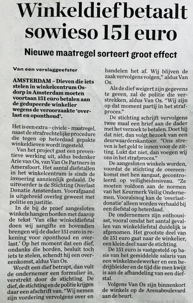 Na pilot van één jaar, in een winkelcentrum in Osdorp, kwamen de eerste cijfers binnen: een daling van 40%. Dit bevestigde dat directe aansprakelijkstelling geschikt is voor het terugdringen van criminaliteit.